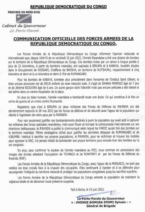 « Depuis 16h25 de ce vendredi 10 juin 2022, l’armée rwandaise a tiré une dizaine de bombes sur le territoire de la République démocratique du Congo », alertent les Forces armées de la RDC. « Ces bombes tirées par des canons à longue portée à plus de 22 kilomètres à partir du territoire rwandais ont explosé à Biruma et à Kabaya, localités situées dans le groupement de Kisigari, chefferie de Bwisha dans le territoire de Rutshuru », précise le communiqué du général Sylvain Ekenge Bomusa Efomi, porte-parole du gouverneur militaire du Nord-Kivu.