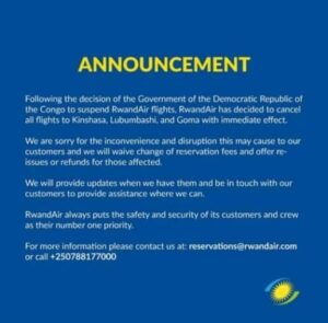 COMMUNIQUE OFFICIEL DU RWANDA SUR LE RWANDAIR. La compagnie aérienne nationale rwandaise RwandAir a annulé tous les vols vers la République démocratique du Congo quelques...